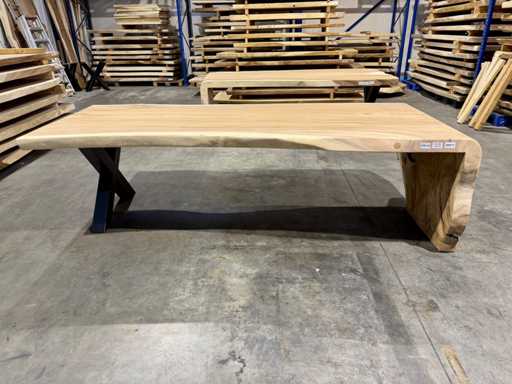 Unieke waterval tafel 8 cm. dik massief uit één stuk; 110/117 cm.; metalen X poot; onderstel wordt er los bijgeleverd; heftruck aanwezig.