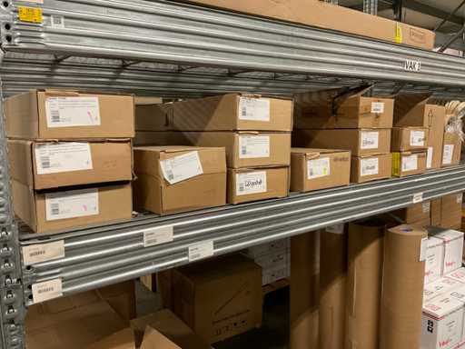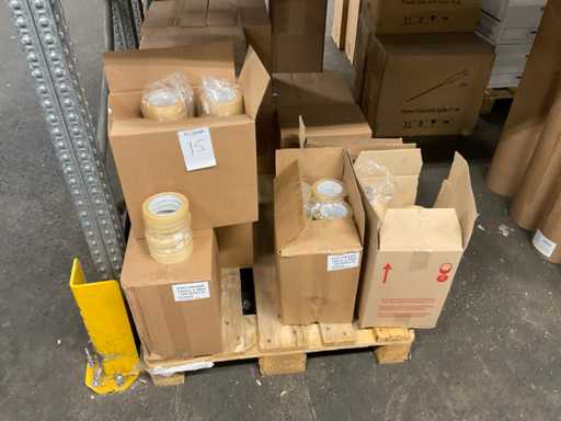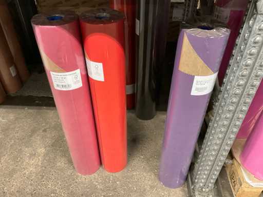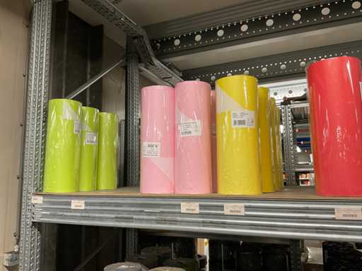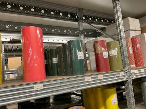 Inhoud van 2 zijden van stelling bestaande o.a. uit folierolhouders, plakband en folie in verschillende kleuren, exclusief stelling