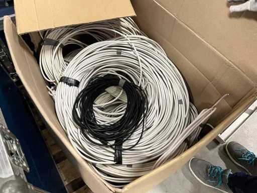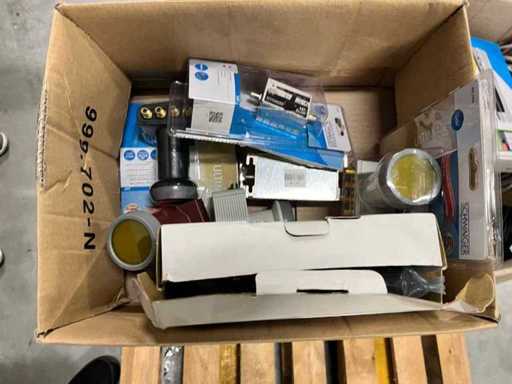 Set bestaande uit meerdere satellietschotels, sommige met bevestigingsaccessoires, DVBT-kamerantennes, ontvangers, diverse kabels, randapparatuur zoals getoond