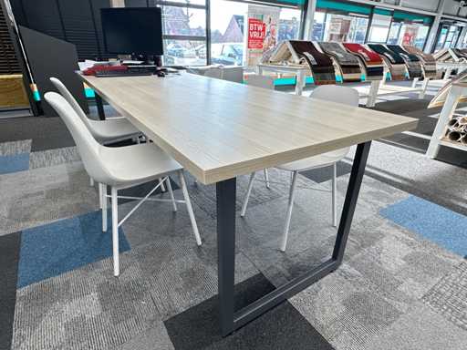 Deze set bestaat uit een tafel met 4 stoelen van Crasssevig. Zithoogte 44 cm. Inclusief 3 hanglampen. Hoogte 30 cm en diameter 6 cm. Exclusief PC met monitor.