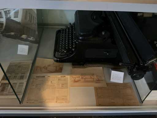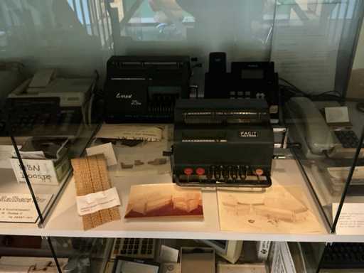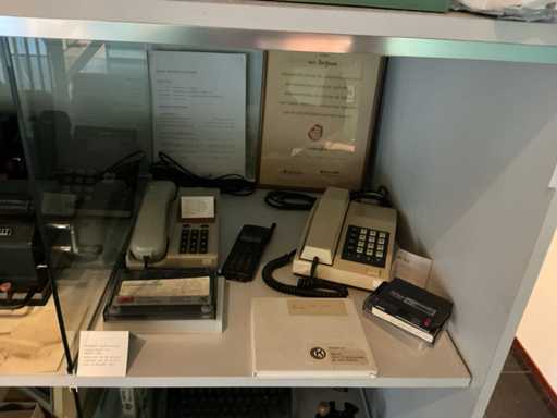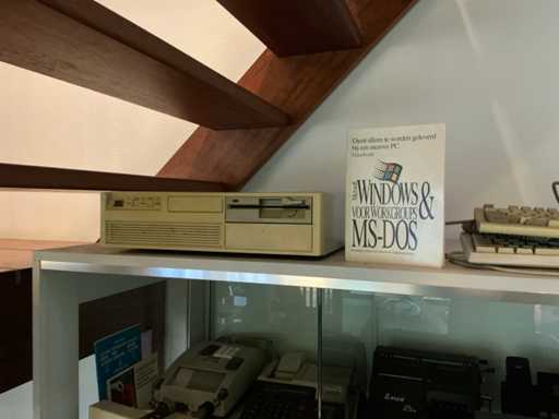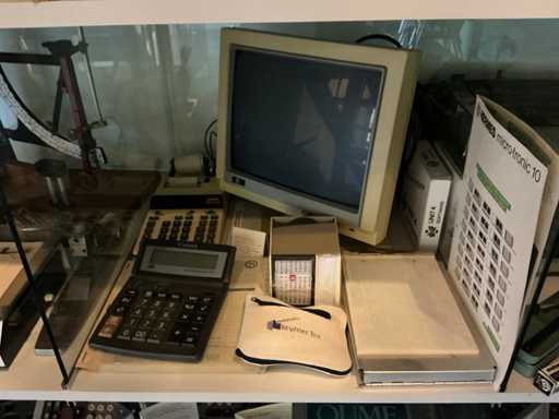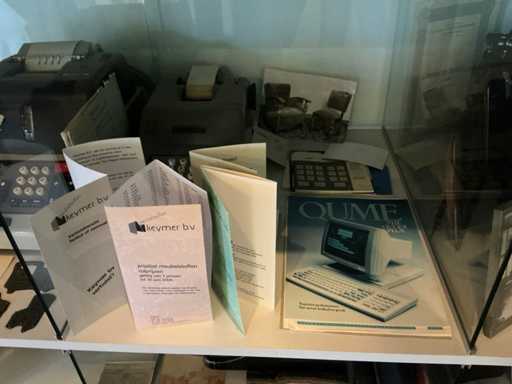1x vitrinekast met diverse vintage artikelen, typmachines, ICT, decoratie, kantoorartikelen etc. Inclusief kast