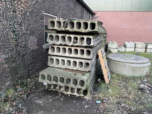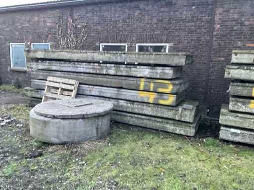 Diverselengtes vloerdelen van beton, langste lengte ca. 500 cm, breedte ca. 117cm, hoogte ca. 25 cm.