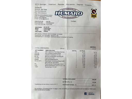 Na het overhandigen van de vrijwaring of een kopie daarvan kan de auto worden meegenomen. Tijdens de ophaaldag is er geen vorkheftruck beschikbaar. Wanneer je de kavel in ontvangst neemt vragen wij je te tekenen voor een goed ontvangst. Daarmee geef je aan dat je de kavel juist en compleet hebt ontvangen. Controleer bij ontvangst dan ook altijd je kavel.