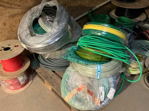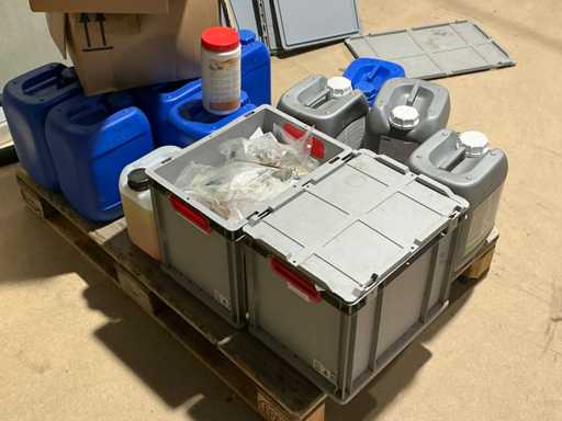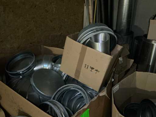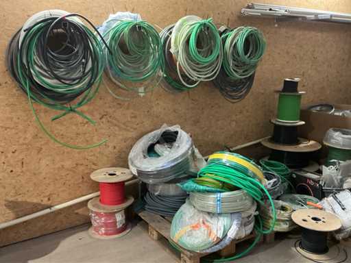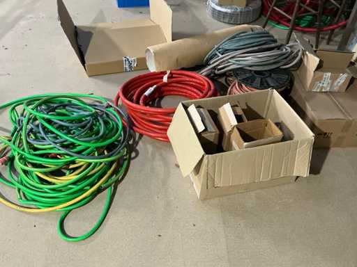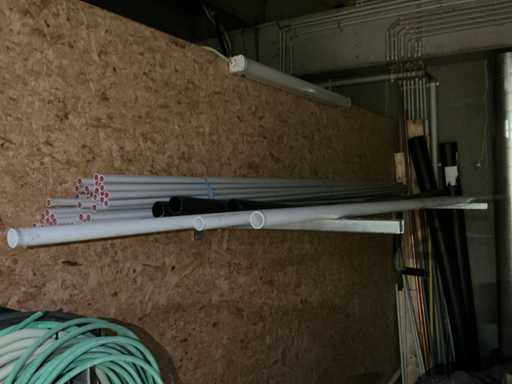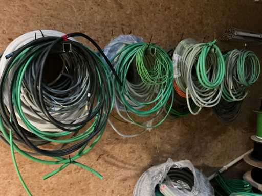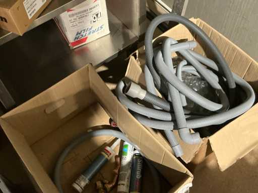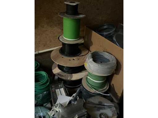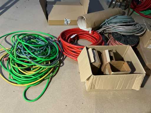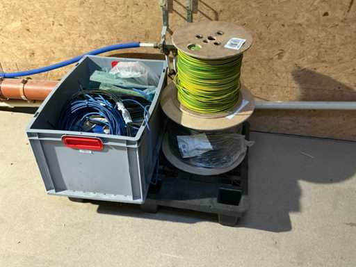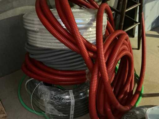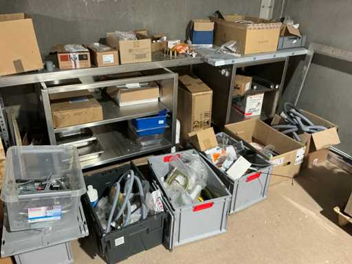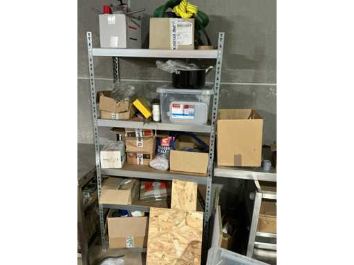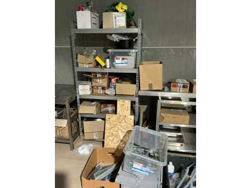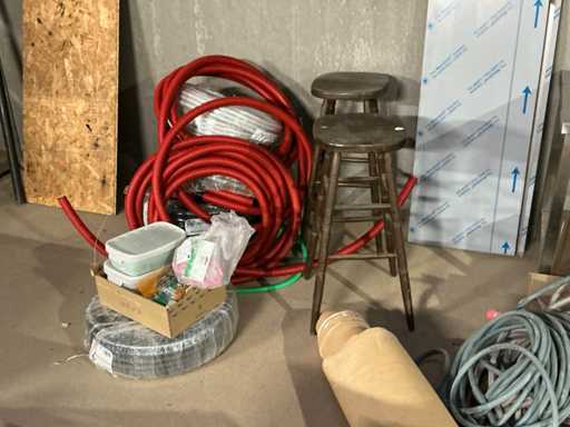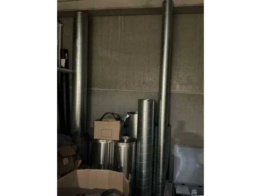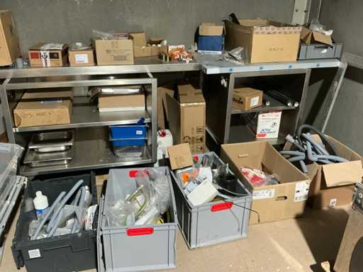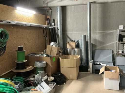 Enige metalen luchtkanalen, kunststof elektrobuizen, enige diverse rollen Preflex buis, elektrokabel, 10 bidons ontkalker Hobart, bevestigingsmateriaal, zekeringen, 2 rvs tafelonderstellen voorzien van leggers, 2 houten barkrukken,