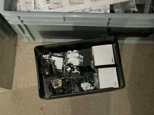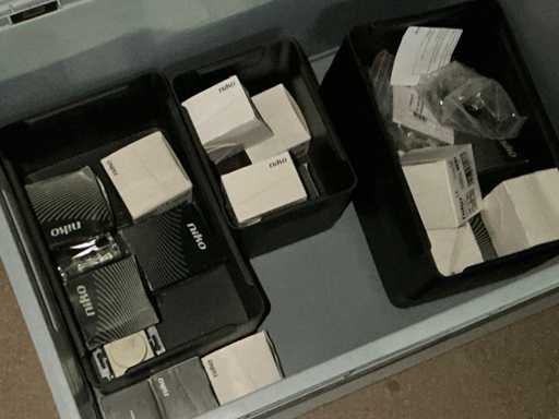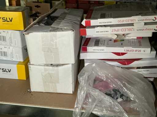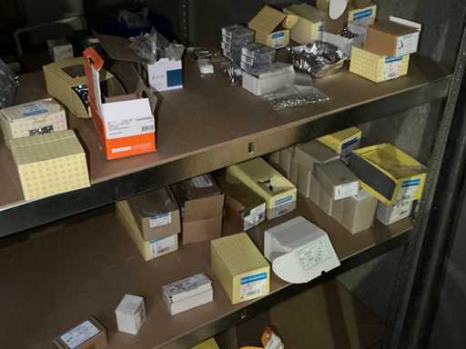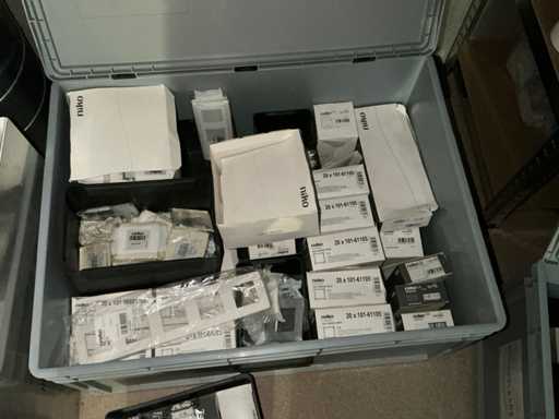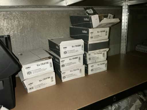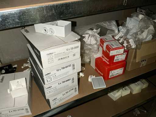 inhoudende partij diverse elektrobenodigdheden waaronder Niko schakelaars, schakelaar inbouwdoosjes en afdekkapjes, klemmen, pvc koppelstukken, diverse reeds aangebroken flexibele buizen,