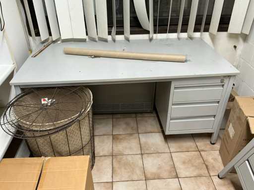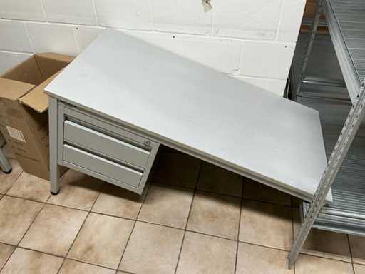 Waaronder bestaande uit een metalen schrijftafel voorzien houten bovenblad en 3 metalen laden, 1 incompleet dito schrijftafel,