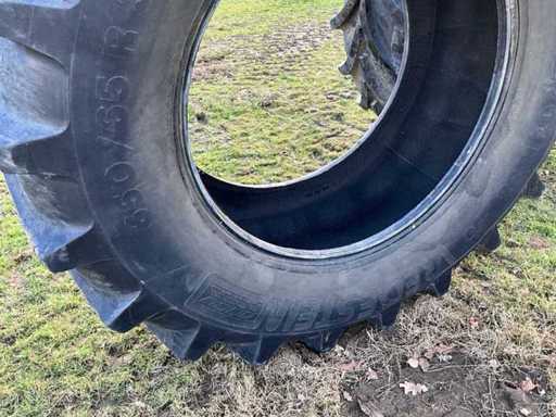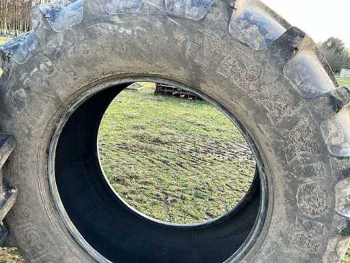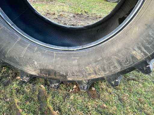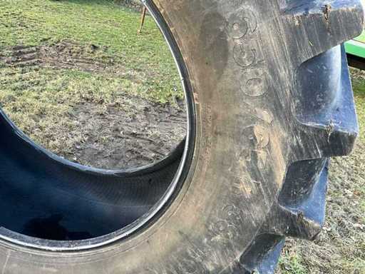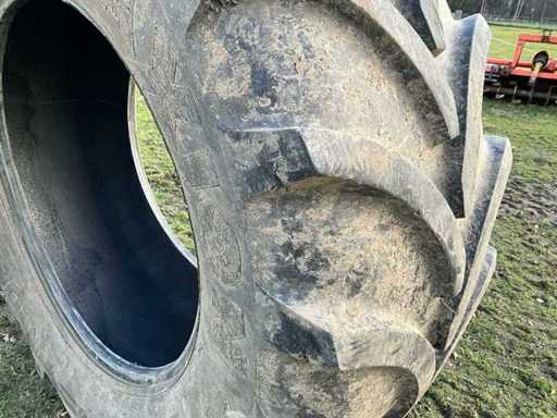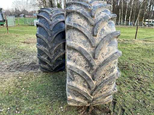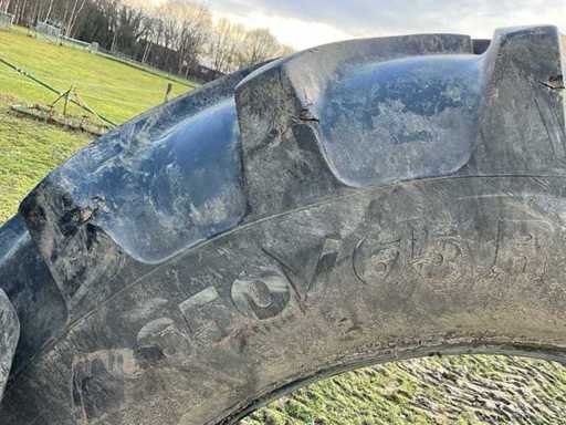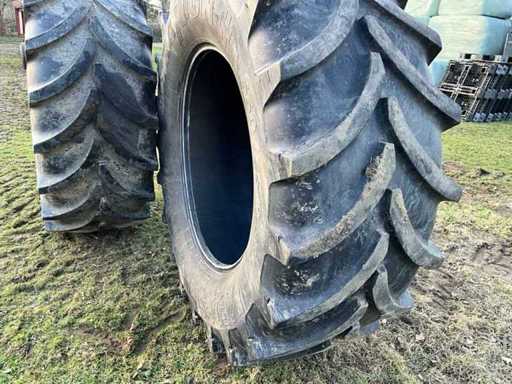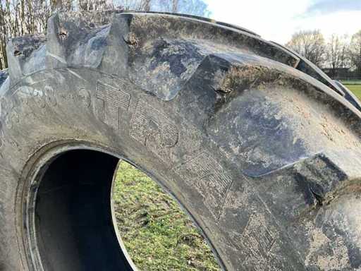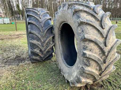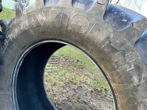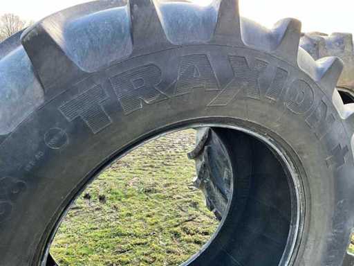 Deze set zware tractorbanden van het type Traxion+ betreft een professionele radiale landbouwbandenconfiguratie in grote maatvoering, geschikt voor zware trekkers, landbouwmachines en industriële toepassingen.
