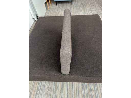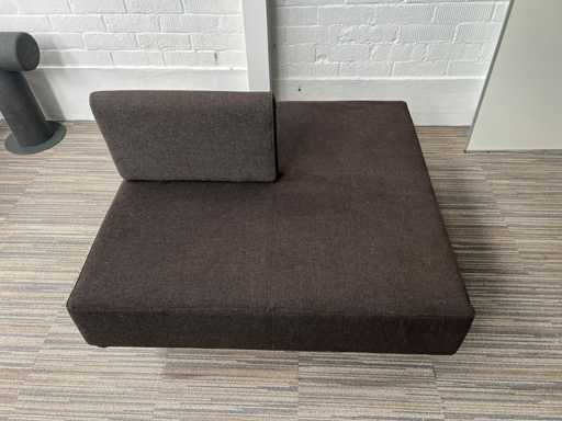 Compacte design-loungebank met centrale rugsteun, bekleed in donkerbruine stof.