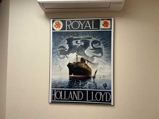 4x Holland houten platen met diverse voorstellingen 76x112cm, 1x Kunstwerk “bezuinigingen, gesigneerd 19/25” 120x95cm