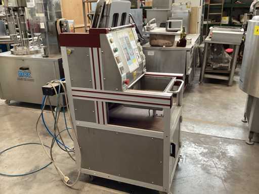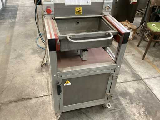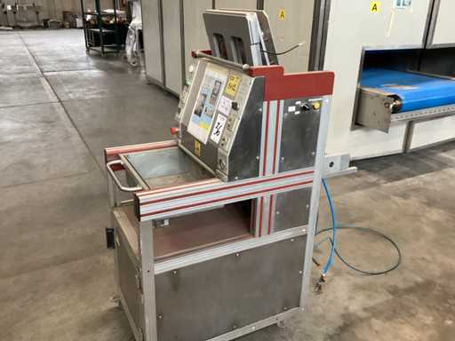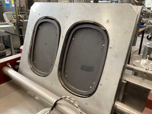 WARMTESEALER-LASMACHINE semi-automatisch met PET-film voor voorgevormde plastic bakjes SVR FAVERANI laagmodel met 2 voetafdrukken. Compleet met vacuümpomp en gasinjectieapparaat. Interne malafmetingen cm. 12x18 x 10,5 uur.