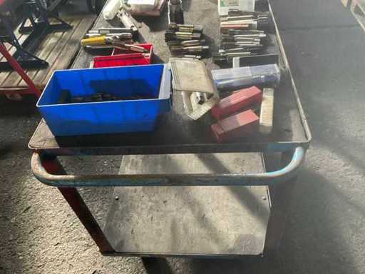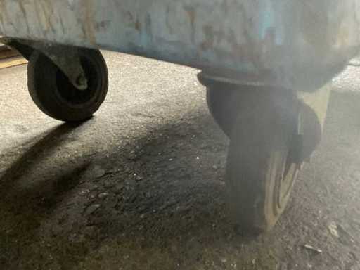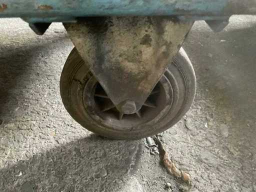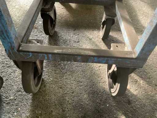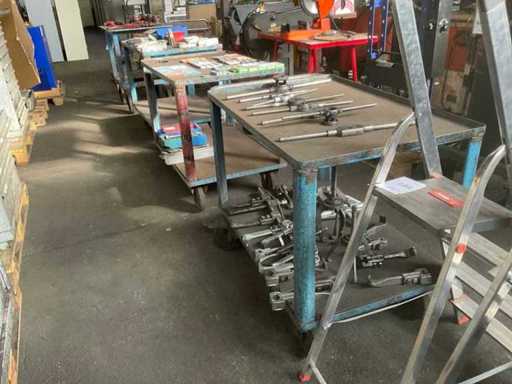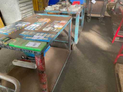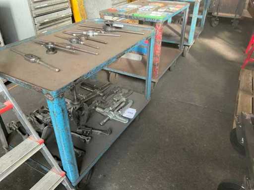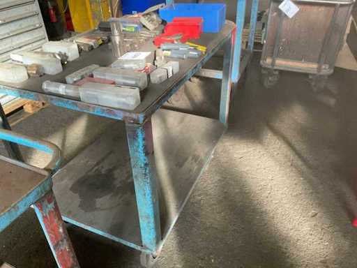 3 stuks metalen werkbank op wielen, afmeting ca. 110 x 70 x 90 cm, voorzien van 2 houten plateaus en 1 stuks metalen werkbank op wielen met metalen werkplateau, afmeting 80 x 71 x 96 cm, materialen op de werkbanken niet inbegrepen