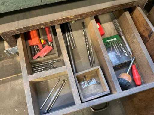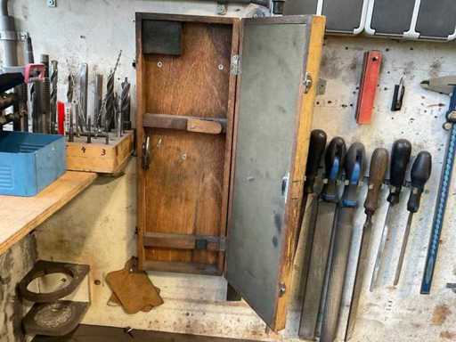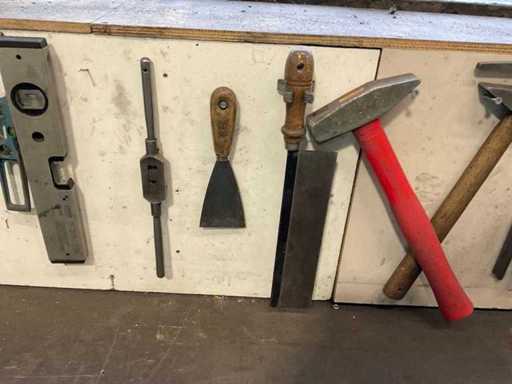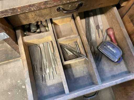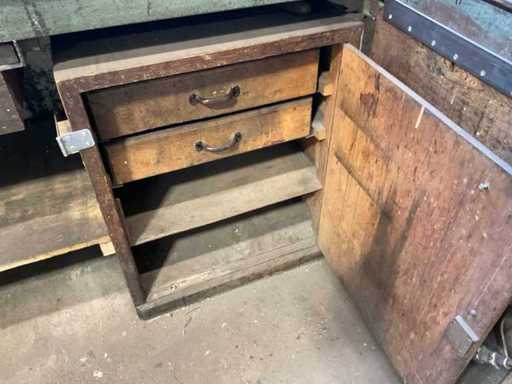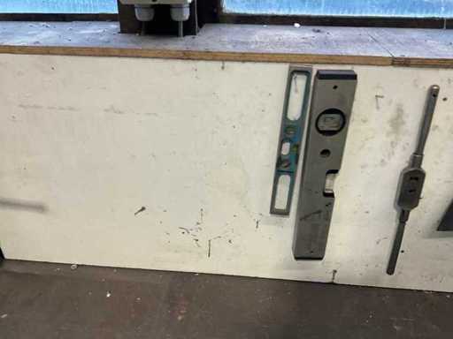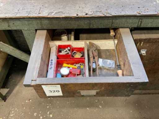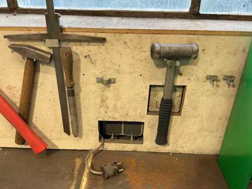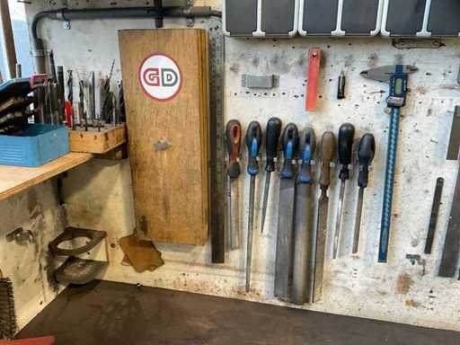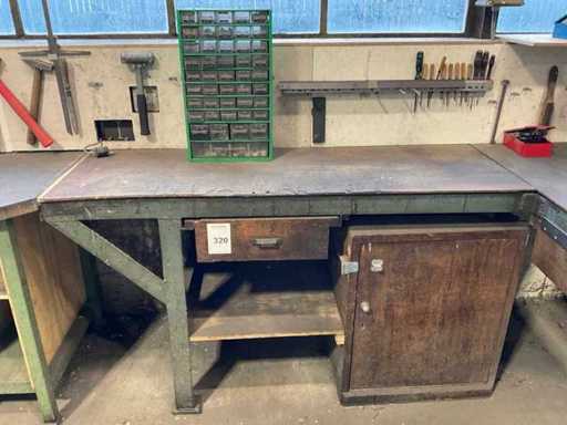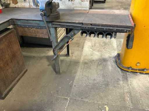 Werkbank v.v. bankschroef, bekbreedte ca. 150 mm, diverse handgereedschappen, werkbank bestaat uit diverse aan elkaar gemonteerde/gelaste delen.