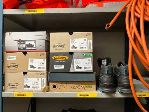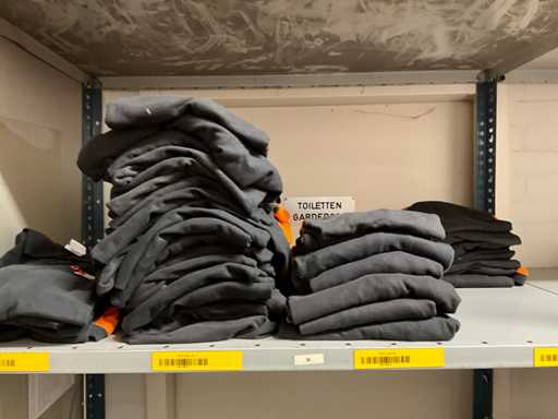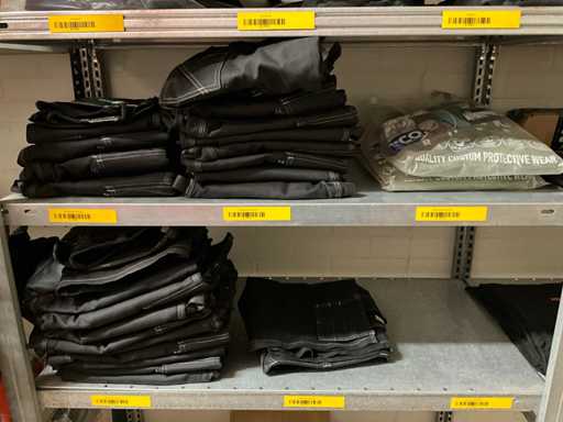 Inhoud van 5 secties legbordstelling; bestaande uit onder andere: werkbroeken, shirts, winterjassen, werkschoenen, regenkleding, veiligheidshelmen. Inclusief 5 secties legbordstelling