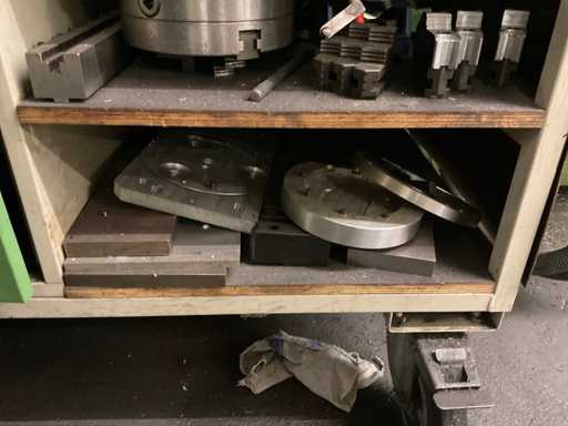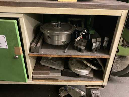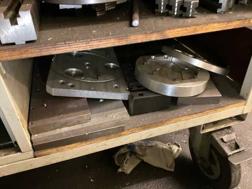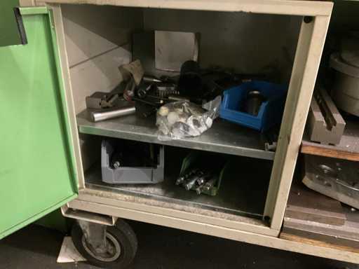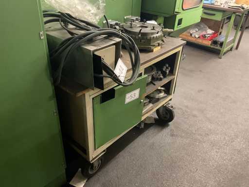 Werkplaatskarretje met accessoires, waaronder 3-kaal chuck