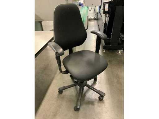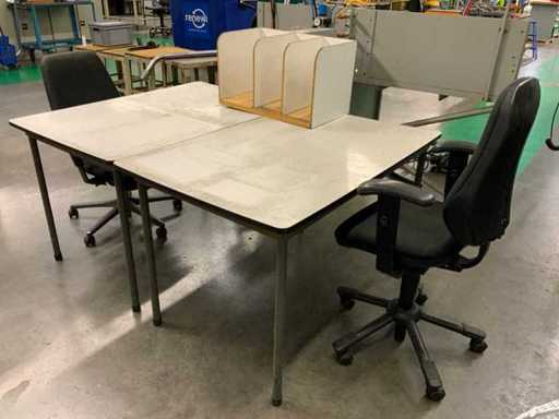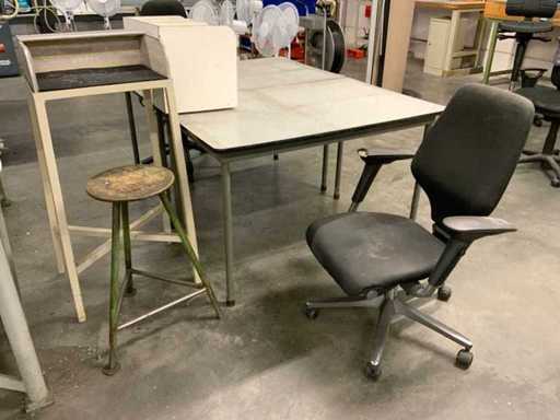 Bestaande uit 2 tafels, 2 bureaustoelen, kruk en tafel