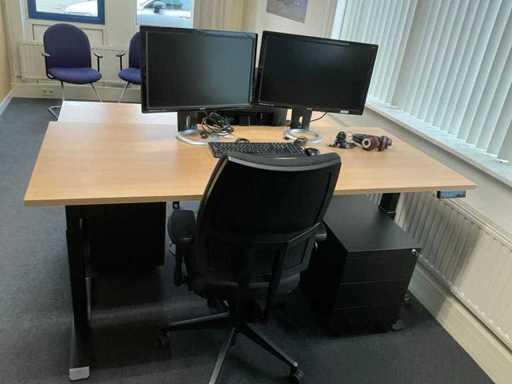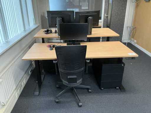 Bestaande uit 2x elektrisch in hoogte verstelbaar bureau, 2x bureaustoel, 2x archiefkast (135x42x75cm), 2x ladekast, 2x stoel, 3x BENQ monitor, toetsenbord, afvalbak en kapstok