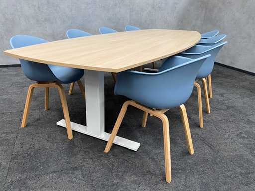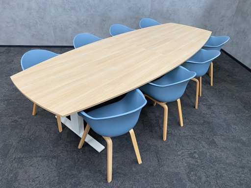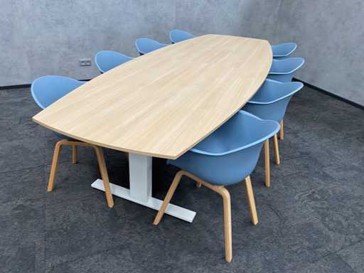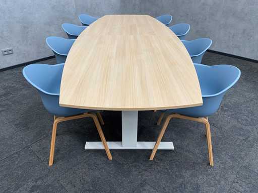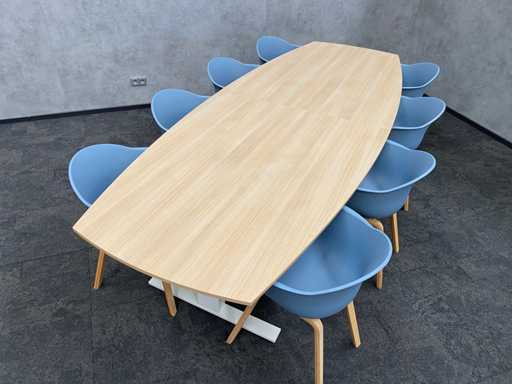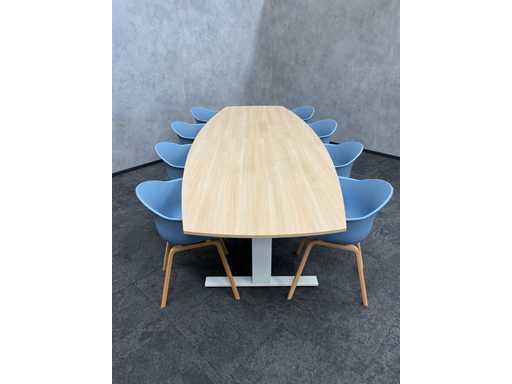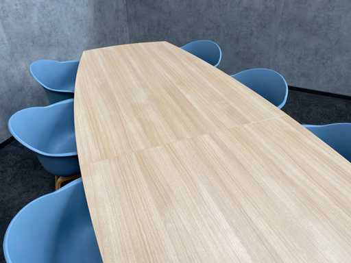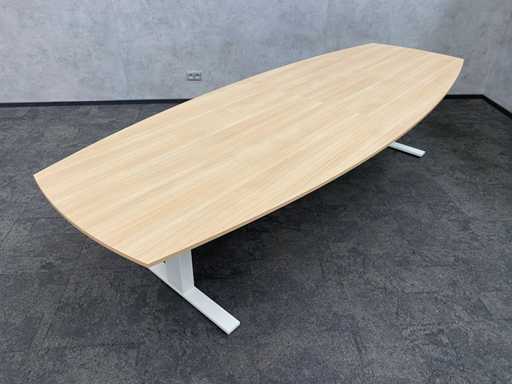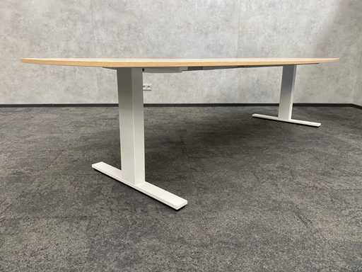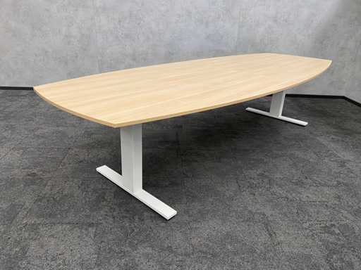 Afm. tafel ca. hoogte 74 cm. breedte 320 cm. diepte 80 tot 120 cm.