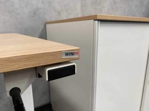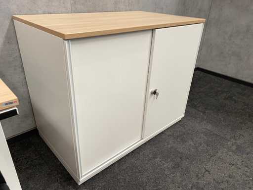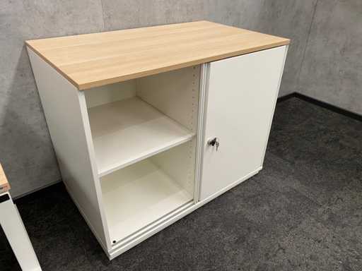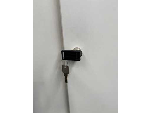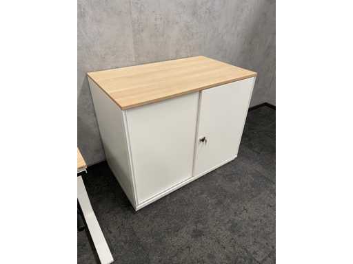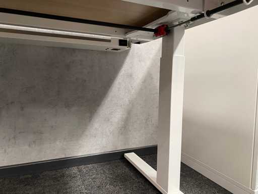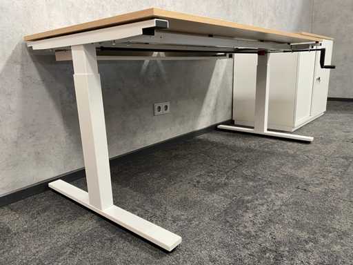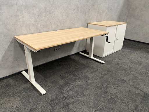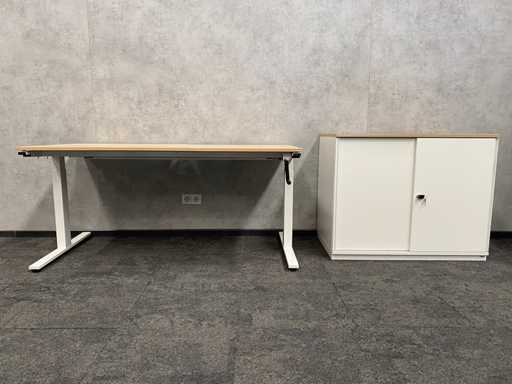 kavel bestaande uit 1x Wini zit-zit slinger bureau met draadgoot. Afm. ca. 160x80 cm. ---- 1x Wini melamine opbergkast. Afm. ca. hxbxd 81x100x60 cm. met 1`verstelbaar legbord, met sleutel
