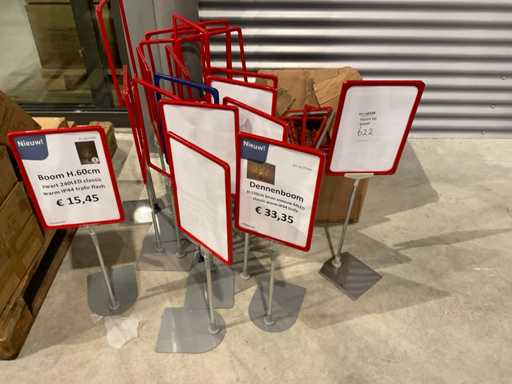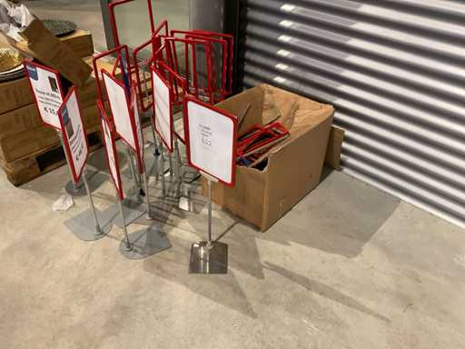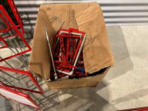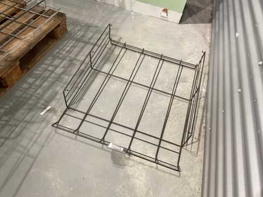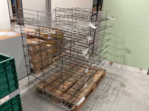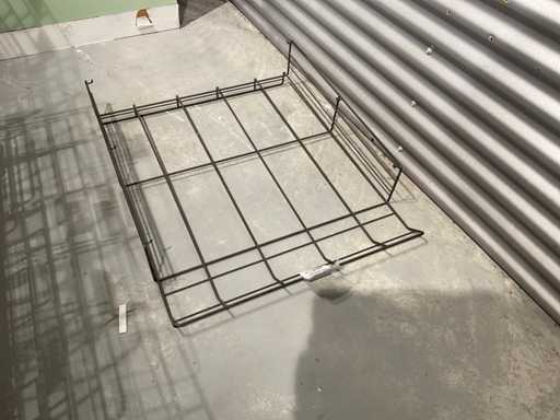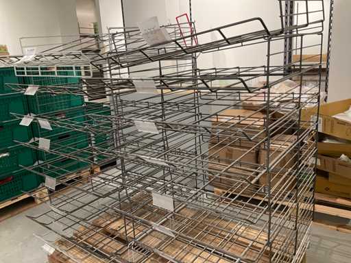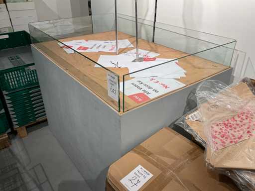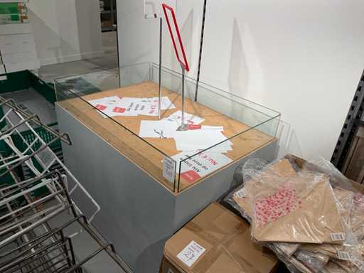 Bestaande uit displaybak v.v. glazen opstaande rand, ca. 120x80x100 cm inclusief rand, 2 metalen stapelbare rekken, ca. 82x66x20 cm en prijskaart/presentaiehouders.