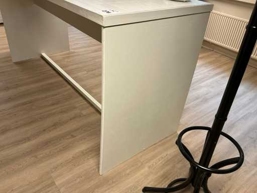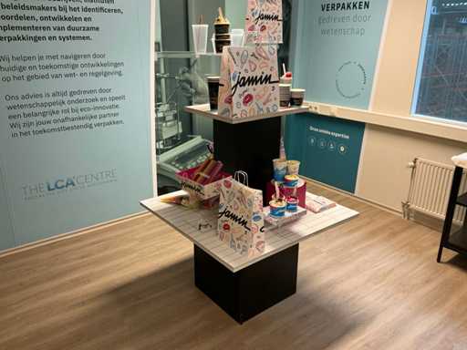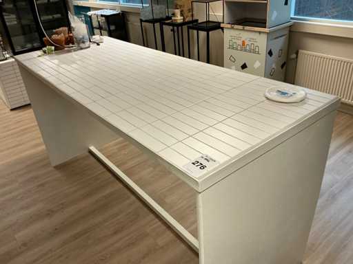 Bestaat uit 1 hoge tafel 224x84x110cm, presentatie tafel 150x147x237cm, presentatie trapeze 100x102x200cm