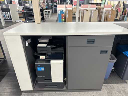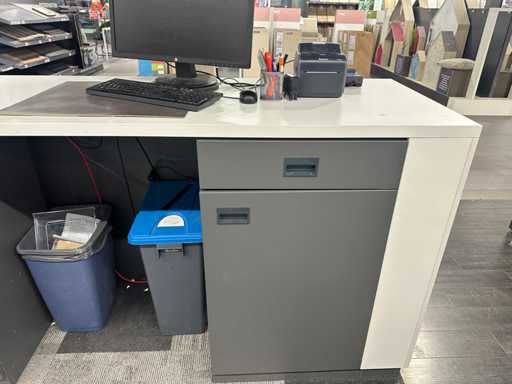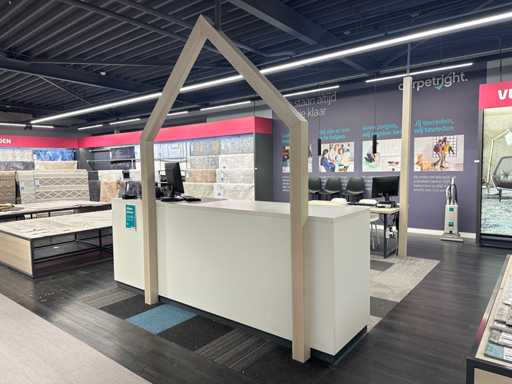 Moderne balie met inhoud en houten huisprofiel. Afmeting van dit houten decoratiestuk is 200x10x275 cm (BxDxH). De inhoud van de balie bestaat uit een kassalade, afstortkluis, kantoorbenodigdheden en een labelprinter. Exclusief PC met monitor, pinapparaat en printer.
