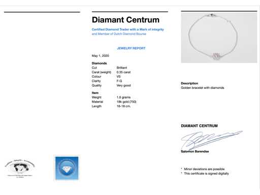 Diamant: Natuurlijk; Slijpvorm: Briljant geslepen; Gewicht (carat): 0.35 carat; Kleur: F-G; Zuiverheid: VS; Slijpkwaliteit: Zeer mooi; Juweel: Armband; Gewicht: 1.6 gram; Afmetingen/lengte: 16 - 18 cm (verstelbaar); Materiaal: 18K goud (750); Conditie: Nieuw; Verpakking: Luxe sieradendoos; Toelichting: De kwaliteit is overgenomen van het rapport behorend bij item. De waardebepaling is een beoordeling van een gecertificeerde diamantair, gebaseerd op consumentenprijzen.; Extra informatie: ook geschikt als enkelbandje; Consumentenprijs: € 3.360,-