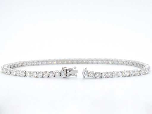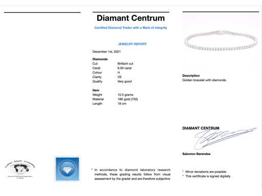 Diamant: Natuurlijk; Aantal: 59 stuks; Slijpvorm: Briljant geslepen; Gewicht (carat): 6.00 carat; Kleur: H; Zuiverheid: VS; Slijpkwaliteit: Zeer mooi; Juweel: Armband; Gewicht: 10.5 gram; Afmetingen/lengte: 18 cm; Materiaal: 18K goud (750); Conditie: Nieuw; Verpakking: Luxe sieradendoos; Toelichting: De kwaliteit is overgenomen van het rapport behorend bij item. De waardebepaling is een beoordeling van een gecertificeerde diamantair, gebaseerd op consumentenprijzen.; Consumentenprijs: € 28.000,-