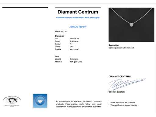 Diamant: Natuurlijk; Aantal: 1 stuk; Slijpvorm: Briljant geslepen; Gewicht (carat): 1.00 carat; Kleur: F; Zuiverheid: VVS; Slijpkwaliteit: Zeer mooi; Juweel: Hanger (incl. Ketting); Gewicht: 3.6 gram; Afmetingen/lengte: 42 cm; Materiaal: 18K goud (750); Conditie: Nieuw; Verpakking: Luxe sieradendoos; Toelichting: De kwaliteit is overgenomen van het rapport behorend bij item. De waardebepaling is een beoordeling van een gecertificeerde diamantair, gebaseerd op consumentenprijzen.; Consumentenprijs: € 25.900,-