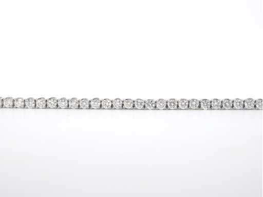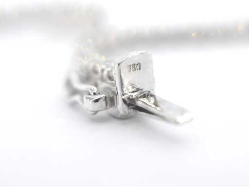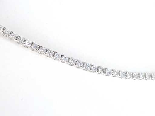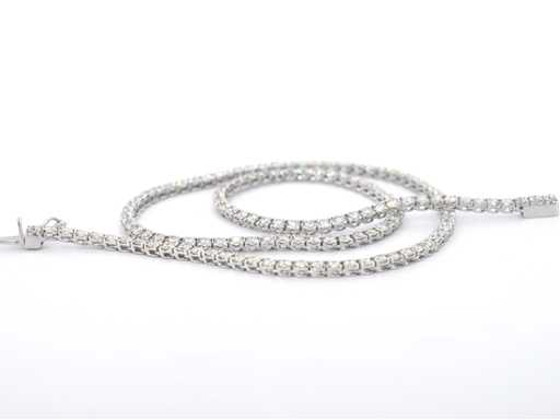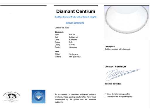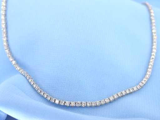 Diamant: Natuurlijk; Aantal: ca. 139 stuks; Slijpvorm: Briljant geslepen; Gewicht (carat): 8.00 carat; Kleur: D-E; Zuiverheid: IF-VVS; Slijpkwaliteit: Excellent; Juweel: Halsketting; Gewicht: 14.6 gram; Afmetingen/lengte: 40 cm; Materiaal: 18K goud (750); Conditie: Nieuw; Verpakking: Luxe sieradendoos; Toelichting: De kwaliteit is overgenomen van het rapport behorend bij item. De waardebepaling is een beoordeling van een gecertificeerde diamantair, gebaseerd op consumentenprijzen.; Consumentenprijs: € 39.200,-