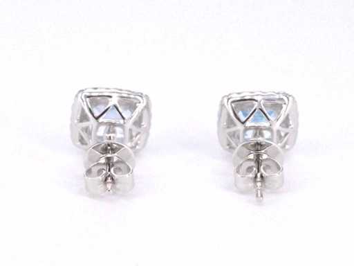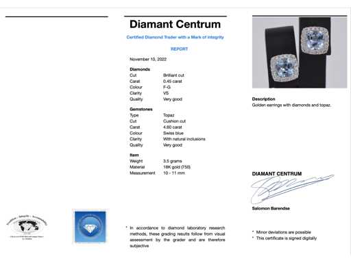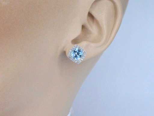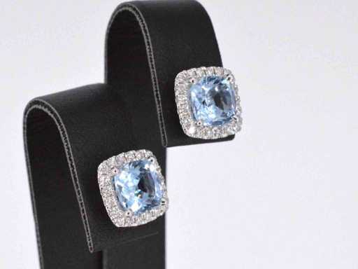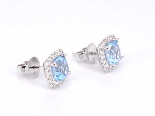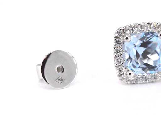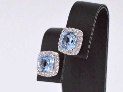 Diamant: Natuurlijk; Aantal: 40 stuks; Slijpvorm: Briljant geslepen; Gewicht (carat): 0.45 carat; Kleur: F-G; Zuiverheid: VS; Slijpkwaliteit: Zeer mooi; Edelsteen: Topaas; Slijpvorm: Kussenvormig; Gewicht (carat): 4.60 carat; Kleur: Swiss blue; Juweel: Oorbellen; Gewicht: 3.5 gram; Afmetingen/lengte: 10 x 11 mm; Materiaal: 18K goud (750); Conditie: Nieuw; Verpakking: Luxe sieradendoos; Toelichting: De kwaliteit is overgenomen van het rapport behorend bij item. De waardebepaling is een beoordeling van een gecertificeerde diamantair, gebaseerd op consumentenprijzen.; Consumentenprijs: € 4.935,-