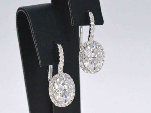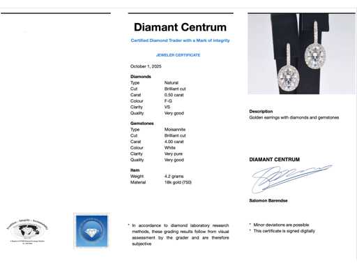 Diamant: Natuurlijk; Slijpvorm: Briljant geslepen; Gewicht (carat): 0.50 carat; Kleur: F-G; Zuiverheid: VS; Slijpkwaliteit: Zeer mooi; Edelsteen: Moissaniet; Aantal: 2 stuks; Slijpvorm: Briljant geslepen; Gewicht (carat): 4.00 carat; Kleur: Wit; Zuiverheid: Zeer zuiver; Slijpkwaliteit: Very good; Juweel: Oorbellen; Gewicht: 4.2 gram; Afmetingen/lengte: 22 x 10 mm; Materiaal: 18K goud (750); Conditie: Nieuw; Verpakking: Luxe sieradendoos; Toelichting: De kwaliteit is overgenomen van het rapport behorend bij item.