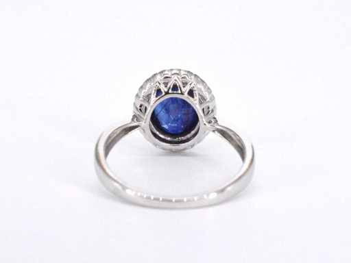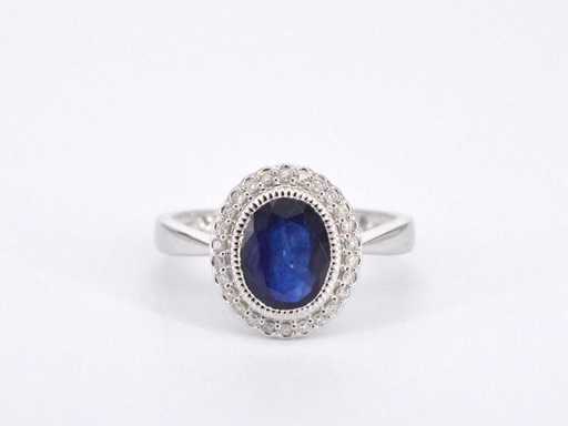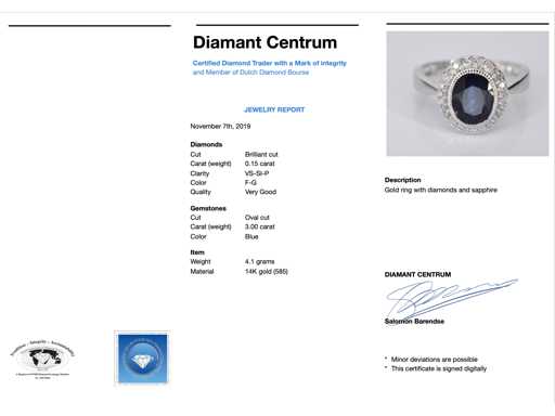 Diamant: Natuurlijk; Slijpvorm: Briljant geslepen; Gewicht (carat): 0.15 carat; Kleur: F-G; Zuiverheid: SI-P; Slijpkwaliteit: Zeer mooi; Edelsteen: Saffier; Slijpvorm: Ovaal; Gewicht (carat): 3.00 carat; Juweel: Ring; Gewicht: 4.1 gram; Ringmaat (op maat gemaakt*): 54 (17.25 mm); Materiaal: 14 karaat (585); Conditie: Nieuw; Verpakking: Luxe sieradendoos; Toelichting: De kwaliteit is overgenomen van het rapport behorend bij item. De waardebepaling is een beoordeling van een gecertificeerde diamantair, gebaseerd op consumentenprijzen.; Consumentenprijs: € 2.468,-