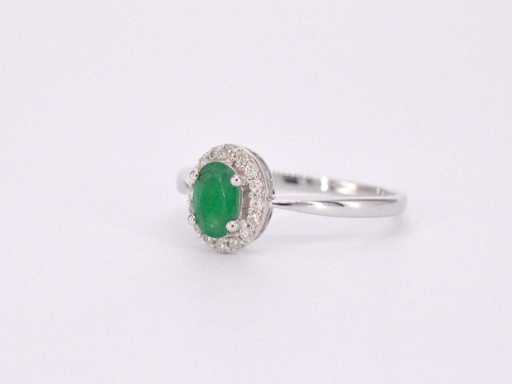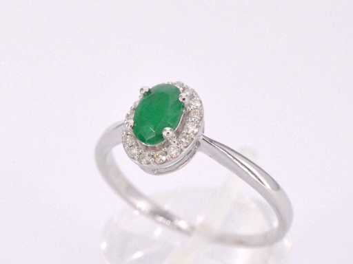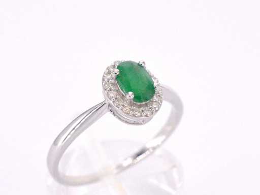 Diamant: Natuurlijk; Slijpvorm: Briljant geslepen; Gewicht (carat): 0.12 carat; Kleur: F-G; Zuiverheid: SI-P; Slijpkwaliteit: Zeer mooi; Edelsteen: Smaragd; Slijpvorm: Ovaal; Gewicht (carat): 0.55 carat; Juweel: Ring; Gewicht: 2.2 gram; Ringmaat (op maat gemaakt*): 54 (17.25 mm); Materiaal: 14k goud (585); Conditie: Nieuw; Verpakking: Luxe sieradendoos; Toelichting: De kwaliteit is overgenomen van het rapport behorend bij item. De waardebepaling is een beoordeling van een gecertificeerde diamantair, gebaseerd op consumentenprijzen.; Consumentenprijs: € 1.348,-