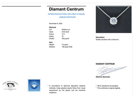 Diamant: Natuurlijk; Aantal: 1 stuk; Slijpvorm: Briljant geslepen; Gewicht (carat): 0.50 carat; Kleur: F-G; Zuiverheid: SI; Slijpkwaliteit: Zeer mooi; Juweel: Hanger (incl. Ketting); Gewicht: 2.2 gram; Afmetingen/lengte: 42 cm; Materiaal: 18k goud (750); Conditie: Vintage; Verpakking: Luxe sieradendoos; Toelichting: De kwaliteit is overgenomen van het rapport behorend bij item. De waardebepaling is een beoordeling van een gecertificeerde diamantair, gebaseerd op consumentenprijzen.; Consumentenprijs: € 6.600,-