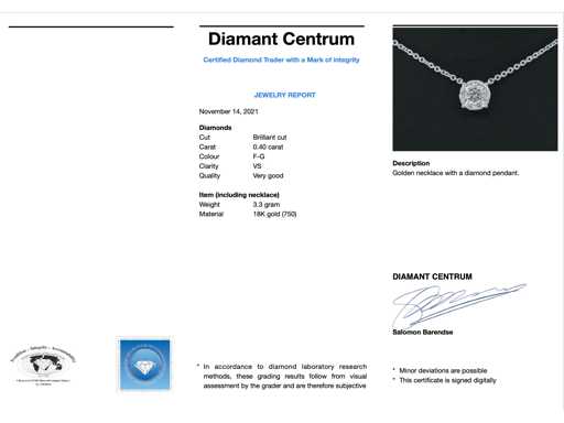 Diamant: Natuurlijk; Slijpvorm: Briljant geslepen; Gewicht (carat): 0.40 carat; Kleur: F-G; Zuiverheid: VS; Slijpkwaliteit: Zeer mooi; Juweel: Hanger (incl. Ketting); Gewicht: 3.3 gram; Materiaal: 18K goud (750); Conditie: Nieuw; Verpakking: Luxe sieradendoos; Toelichting: De kwaliteit is overgenomen van het rapport behorend bij item. De waardebepaling is een beoordeling van een gecertificeerde diamantair, gebaseerd op consumentenprijzen.; Consumentenprijs: € 5.005,-