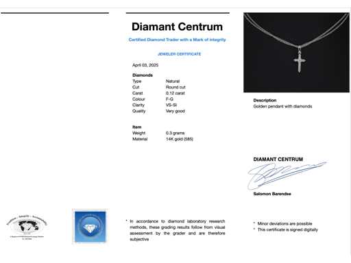 Diamant: Natuurlijk; Aantal: 10 stuks; Slijpvorm: Rond geslepen; Gewicht (carat): 0.12 carat; Kleur: F-G; Zuiverheid: VS-SI; Slijpkwaliteit: Zeer mooi; Juweel: Hanger (excl. ketting); Gewicht: 0.3 gram; Afmetingen/lengte: 1.5 cm; Materiaal: 14k goud (585); Conditie: Nieuw; Verpakking: Luxe sieradendoos; Toelichting: De kwaliteit is overgenomen van het rapport behorend bij item. De waardebepaling is een beoordeling van een gecertificeerde diamantair, gebaseerd op consumentenprijzen.; Consumentenprijs: € 455,-