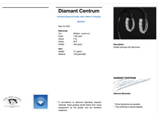 Diamant: Natuurlijk; Aantal: 100 stuks; Slijpvorm: Briljant en rond geslepen; Gewicht (carat): 1.00 carat; Kleur: F-G; Zuiverheid: SI-P; Slijpkwaliteit: Zeer mooi; Juweel: Oorbellen; Gewicht: 5.1 gram; Afmetingen/lengte: 21 mm; Materiaal: 14 karaat (585); Conditie: Nieuw; Verpakking: Luxe sieradendoos; Toelichting: De kwaliteit is overgenomen van het rapport behorend bij item. De waardebepaling is een beoordeling van een gecertificeerde diamantair, gebaseerd op consumentenprijzen.; Consumentenprijs: € 4.533,-