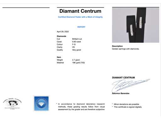 Diamant: Natuurlijk; Slijpvorm: Briljant geslepen; Gewicht (carat): 0.60 carat; Kleur: F-G; Zuiverheid: VS; Slijpkwaliteit: Zeer mooi; Juweel: Oorbellen; Gewicht: 4.4 gram; Afmetingen/lengte: 14 x 13 mm; Materiaal: 18K goud (750); Conditie: Nieuw; Verpakking: Luxe sieradendoos; Toelichting: De kwaliteit is overgenomen van het rapport behorend bij item. De waardebepaling is een beoordeling van een gecertificeerde diamantair, gebaseerd op consumentenprijzen.; Consumentenprijs: € 4.218,-