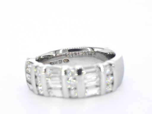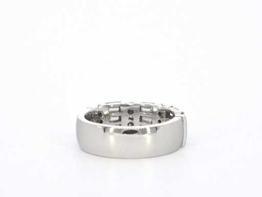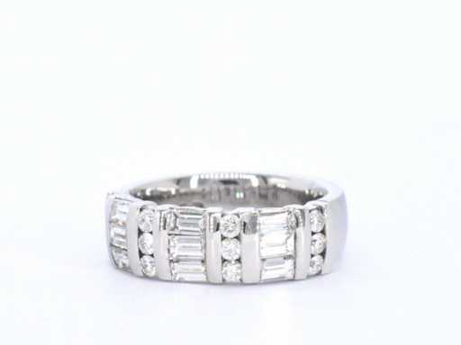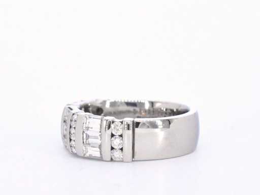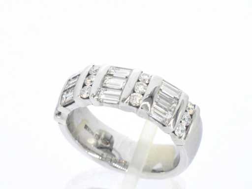 Diamant: Natuurlijk; Aantal: 9 stuks; Slijpvorm: baguette geslepen; Gewicht (carat): 1.26 carat; Kleur: F; Zuiverheid: VVS; Slijpkwaliteit: Zeer mooi; Diamant (secundair): Diamanten; Aantal diamanten: 12 stuks; Slijpvorm: Briljant geslepen; Gewicht (carat): 0.36 carat; Kleur: F; Zuiverheid: VVS; Slijpkwaliteit: Zeer mooi; Juweel: Ring; Merk: Rensini; Gewicht: 9.5 gram; Ringmaat (op maat gemaakt*): 55 (17.5 mm); Materiaal: 14k goud (585); Conditie: Zo goed als nieuw; Verpakking: Luxe sieradendoos; Toelichting: De kwaliteit is overgenomen van het rapport behorend bij item. De waardebepaling is een beoordeling van een gecertificeerde diamantair, gebaseerd op consumentenprijzen.; Consumentenprijs: € 11.200,-