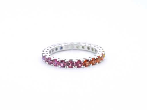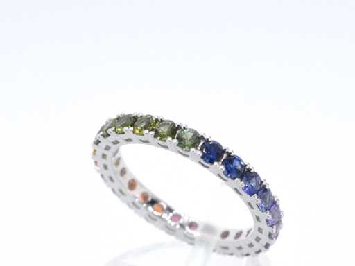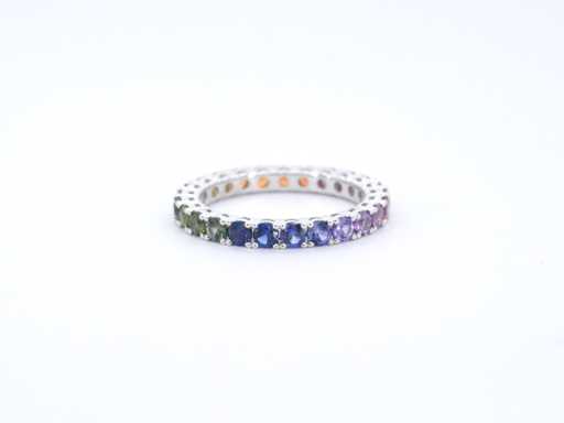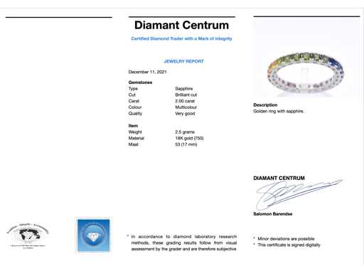 Edelsteen: Saffieren; Aantal: 25 stuks; Slijpvorm: Briljant geslepen; Gewicht (carat): 2.00 carat; Kleur: Multicolour; Slijpkwaliteit: Very good; Juweel: Ring; Gewicht: 2.5 gram; Ringmaat (op maat gemaakt*): 53 (17 mm); Materiaal: 18K goud (750); Conditie: Nieuw; Verpakking: Luxe sieradendoos; Toelichting: De kwaliteit is overgenomen van het rapport behorend bij item. De waardebepaling is een beoordeling van een gecertificeerde diamantair, gebaseerd op consumentenprijzen.; Consumentenprijs: € 3.675,-