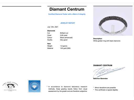 Diamant: Natuurlijk; Slijpvorm: Briljant geslepen; Gewicht (carat): 0.60 carat; Kleur: zwart (enhanced); Slijpkwaliteit: zeer mooi; Juweel: Ring; Gewicht: 1.8 gram; Ringmaat (op maat gemaakt*): 54 (17.25 mm); Materiaal: 14 karaat (585); Conditie: Nieuw; Verpakking: Luxe sieradendoos; Toelichting: De kwaliteit is overgenomen van het rapport behorend bij item. De waardebepaling is een beoordeling van een gecertificeerde diamantair, gebaseerd op consumentenprijzen.; Consumentenprijs: € 1.610,-