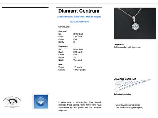 Diamant: Natuurlijk; Aantal: 1 stuk; Slijpvorm: Briljant geslepen; Gewicht (carat): 1.50 carat; Kleur: F-G; Zuiverheid: SI; Slijpkwaliteit: zeer mooi; Diamant (secundair): Diamanten; Aantal diamanten: 5 stuks; Slijpvorm: Briljant geslepen; Gewicht (carat): 0.10 carat; Kleur: F-G; Zuiverheid: VS; Slijpkwaliteit: Zeer mooi; Juweel: Hanger (excl. ketting); Gewicht: 1.5 gram; Afmetingen/lengte: 1.6 x 0.8 cm; Materiaal: 18k goud (750); Conditie: Nieuw; Verpakking: Luxe sieradendoos; Toelichting: De kwaliteit is overgenomen van het rapport behorend bij item. De waardebepaling is een beoordeling van een gecertificeerde diamantair, gebaseerd op consumentenprijzen.; Consumentenprijs: € 17.500,-
