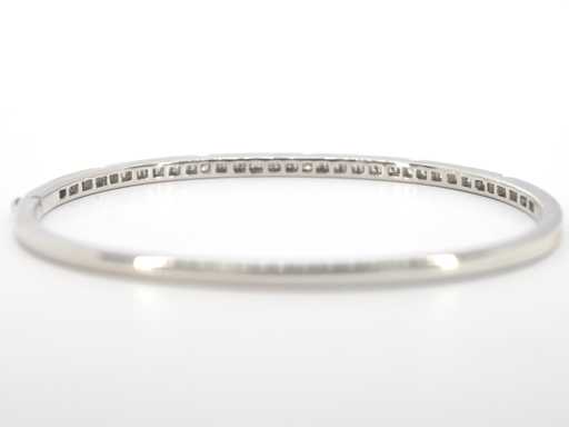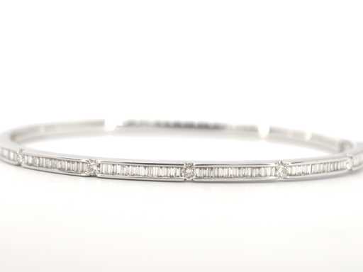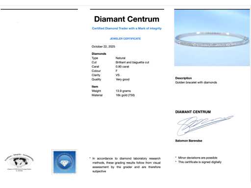 Diamant: Natuurlijk; Slijpvorm: Briljant en baguette geslepen; Gewicht (carat): 0.90 carat; Kleur: F; Zuiverheid: VS; Slijpkwaliteit: Zeer mooi; Juweel: Armband; Gewicht: 13.9 gram; Afmetingen/lengte: 60 x 50 mm; Materiaal: 18K goud (750); Conditie: Nieuw; Verpakking: Luxe sieradendoos; Toelichting: De kwaliteit is overgenomen van het rapport behorend bij item. De waardebepaling is een beoordeling van een gecertificeerde diamantair, gebaseerd op consumentenprijzen.; Consumentenprijs: € 15.200,-