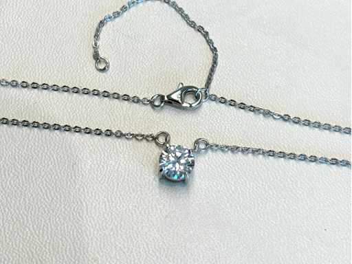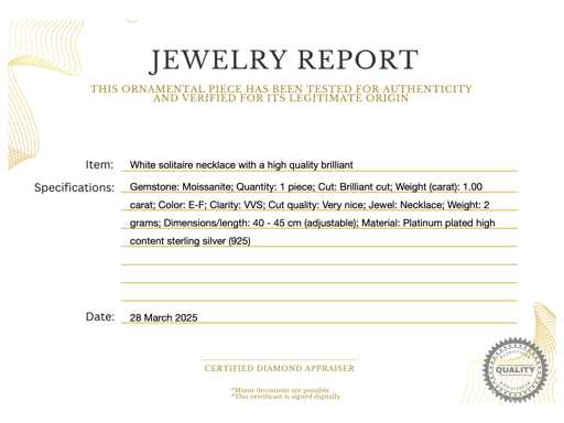 Edelsteen: Moissaniet; Aantal: 1 stuk; Slijpvorm: Briljant geslepen; Gewicht (carat): 1.00 carat; Kleur: E-F; Zuiverheid: VVS; Slijpkwaliteit: Zeer mooi; Juweel: Halsketting; Merk: Harmony; Gewicht: 2 gram; Afmetingen/lengte: 40 - 45 cm (verstelbaar); Materiaal: Geplatineerd hoog gehalte sterling zilver (925); Conditie: Nieuw; Verpakking: Sieradendoos of fluwelen etui; Toelichting: De kwaliteit is overgenomen van het rapport behorend bij item. De waardebepaling is een beoordeling van een gecertificeerde diamantair, gebaseerd op consumentenprijzen.; Extra informatie: Het gemeten gewicht van de edelstenen is volgens diamant maten; Consumentenprijs: € 760,-