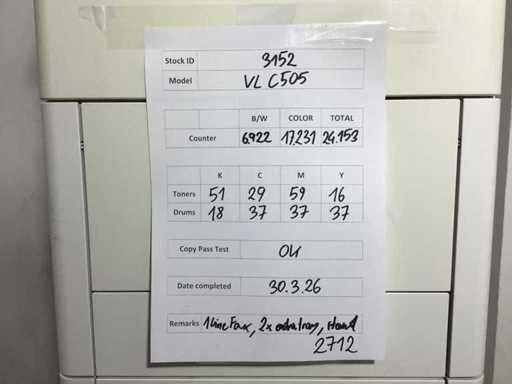 A4 multifunctionele kopieermachine in kleur, teller toont in totaal 24.153 afdrukken, kopieerstatus OK, gecontroleerd door een legitieme technicus! PostScript 3 is geactiveerd! Raadpleeg de bijgevoegde foto's voor de resterende toner- en trommelniveaus in percentage! De machine heeft fax met 1 lijn, 2 extra lade en standaard inbegrepen!