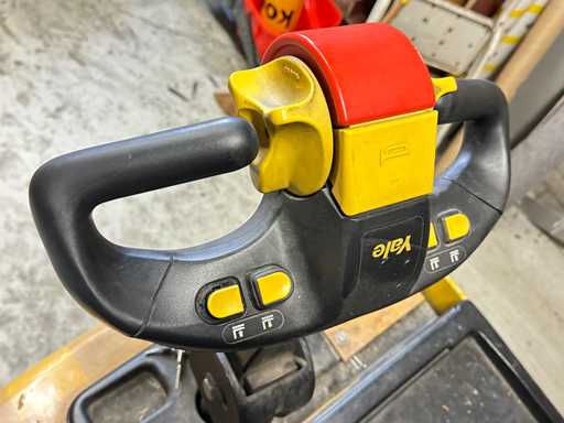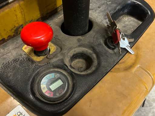 Deze elektrische stapelaar is voorzien van een draagdoorn van 310 cm en is voorzien van oplader.