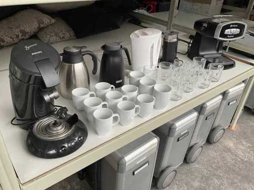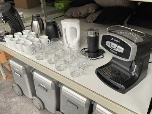 Bestaande uit senseo, melkopschuimer, waterkoker, thermoskannen, mokken en theeglazen Koper dient zelf zorg te dragen voor inpakmateriaal. Dit kavel bevindt zich op de 1e verdieping welke bereikbaar is via de trap