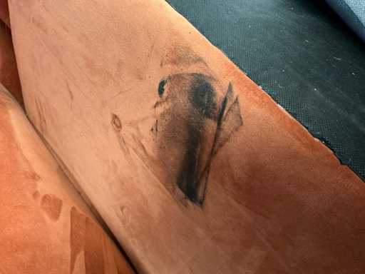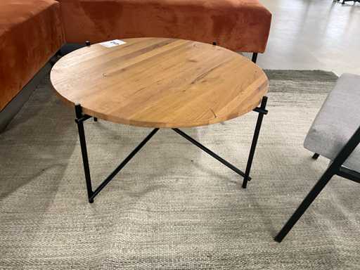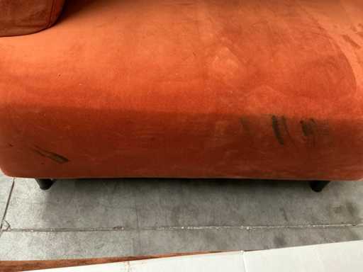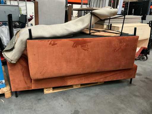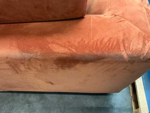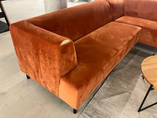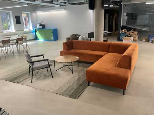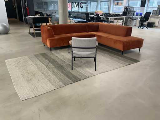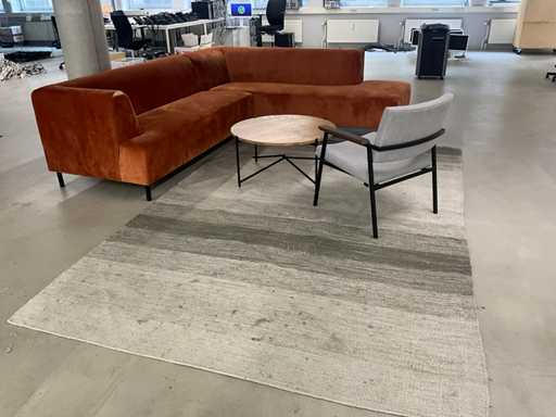 Bestaande uit: hoekbank 270x230x75cm, koffietafel Ø 79cm hoogte 39cm, stoel, vloerkleed 306x205cm. Let op vlekken in de zithoek