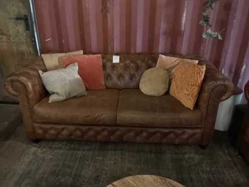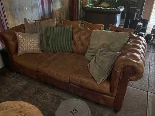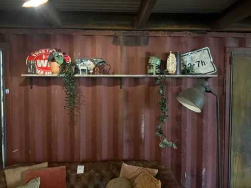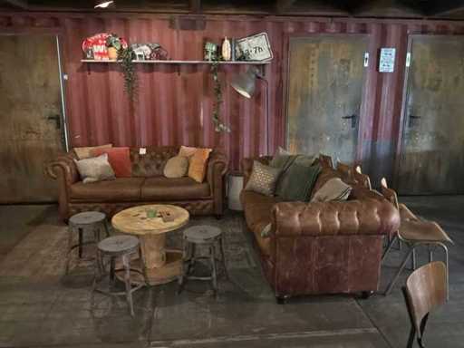 Bestaande uit: 1x driezitsbank 200x87x80cm, 1x tweezitsbank 200x87x80cm, tafel met 3 krukjes, vloerlamp, wandplank met decoratie materiaal.