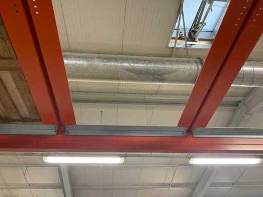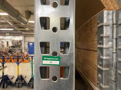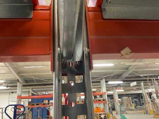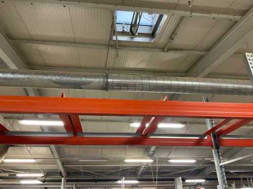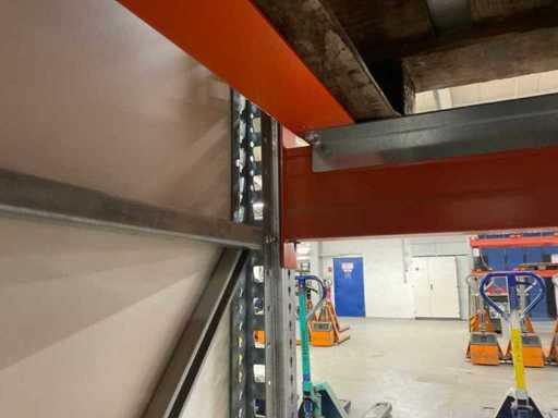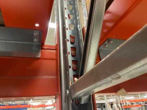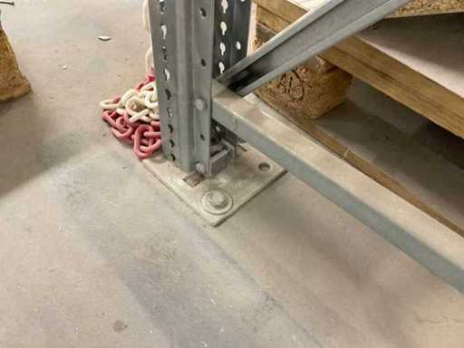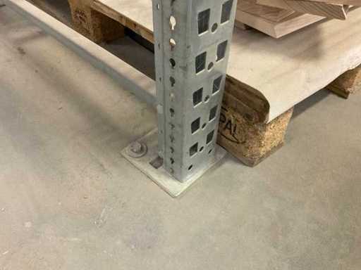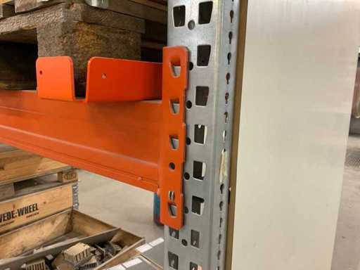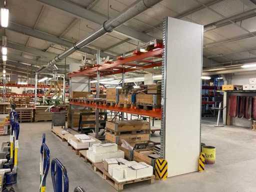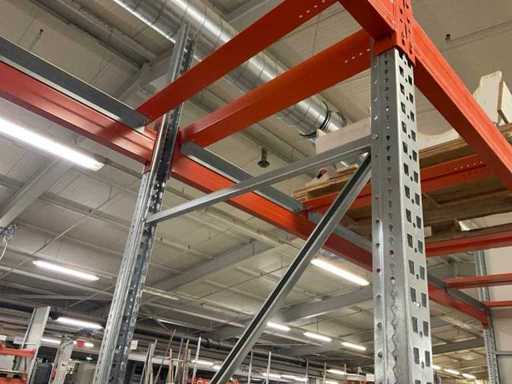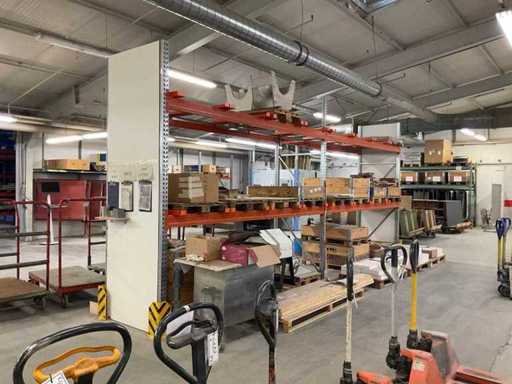 Zware plank bestaande uit: 3 standaards ca. 1100x3300mm, 8 vakwerkten circa 3600mm, inclusief pallethouders, met inhoud